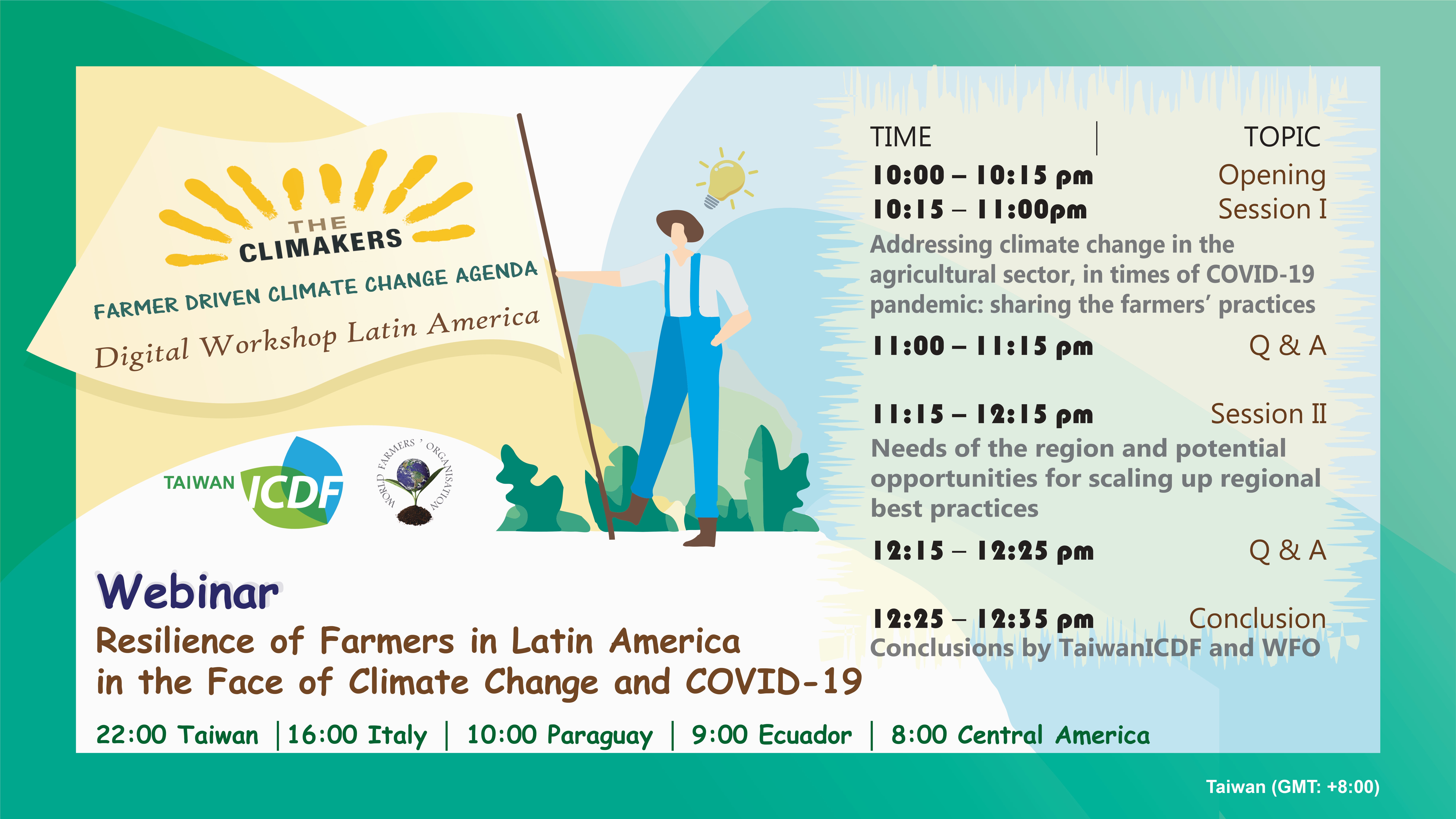 國合會將與世界農民組織(World Farmers Organization, WFO)共同舉辦「拉丁美洲區域農民因應氣候變遷及後新冠肺炎疫情時期農業復甦線上工作坊」,邀請瓜地馬拉、尼加拉瓜、宏都拉斯、貝里斯、巴拉圭及厄瓜多等6友邦農民代表發表該區域農民面對氣候變遷與新冠疫情之衝擊與協助需求,並邀請中美洲區域組織農業及金融專家學者共同討論,集思廣益探討協助農民在後疫情時代下,氣候變遷調適作為。