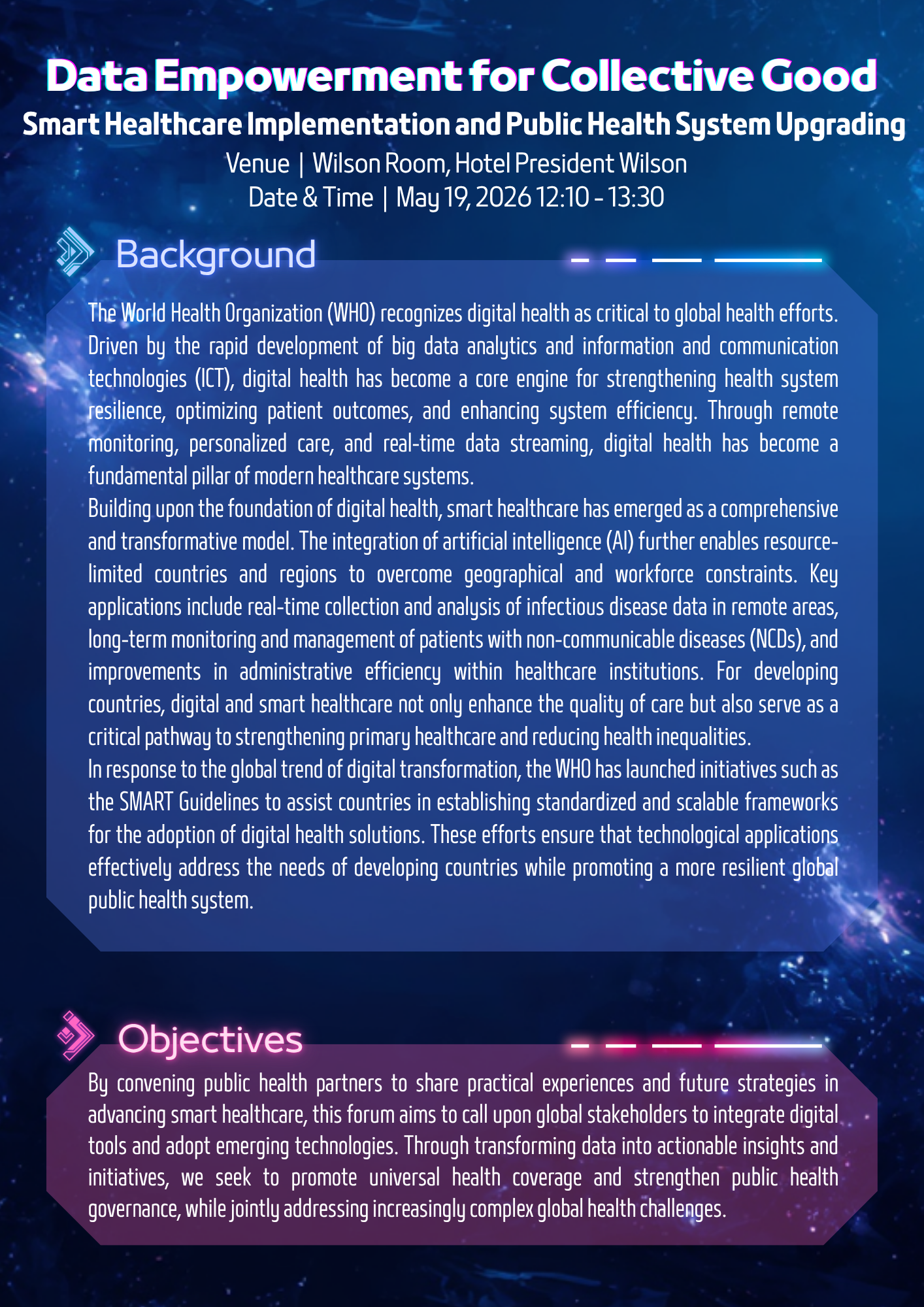 藉由邀集國際上公衛領域的強大夥伴,分享推動「智慧醫療」的寶貴經驗及未來佈局,攜手倡議全球深化整合數位工具並採納新興技術,將數據轉化為促進全民健康及提升公衛治理的關鍵力量,共同應對日益複雜的全球衛生課題。