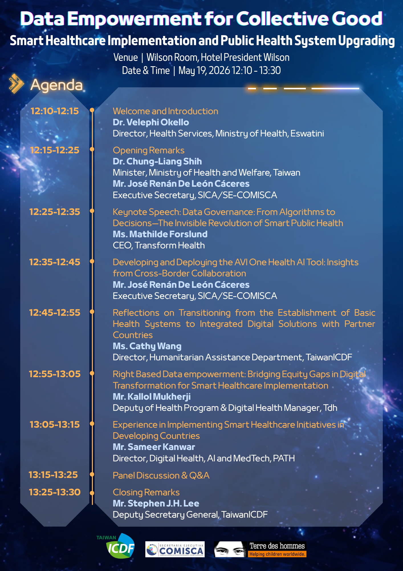 本論壇邀集國際公衛領域傑出代表,共同研討數位醫療之願景。我衛生福利部石崇良部長及合辦單位SICA負責衛生事務之「中美洲暨多明尼加衛生部長理事會執行秘書處」(SE-COMISCA)執行秘書José Renán De León Cáceres致開幕詞,並由史瓦帝尼衛生部醫事司司長Dr. Velephi Okello擔任主持人;專題講座由全球倡議組織Transform Health執行長Ms. Mathilde Forslund以「數據治理:從演算到決策,啟動智慧公衛治理的隱形革命」為題進行分享;於綜合座談部分,國合會人道援助處王宏慈處長分享該會在資源有限之國家從基礎系統建置邁向整合應用發展之經驗;由SE-COMISCA執行秘書José Renán De León Cáceres擔任講者,分享跨國合作開發及運用AI工具AVI One Health之經驗;由知名國際非政府組織Tdh數位健康計畫副處長Mr. Kallol Mukherji以「以權利為本的數據賦能:弭平數位轉型落差,推動智慧醫療發展」為題分享,另有PATH數位醫療與人工智慧部總監Mr. Sameer Kanwar分享於發展中國家推動智慧醫療計畫之經驗;最後由國合會李志宏副秘書長致閉幕詞。