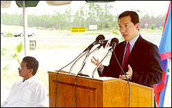 本會與美洲開發銀行於中美洲貝里斯合作融資進行之「南部公路整建計畫」,已於九月廿六日在貝里斯舉行通車暨紀念牌揭幕典禮,本會楊秘書長子葆並受邀與會致詞。其他與會貴賓還包括貝國工務部長Marin及我駐貝里斯大使蔡大使爾晃。(右圖為本會楊秘書長子葆受邀與會致詞情形) |