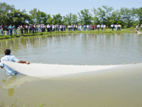 | 觀摩會工作人員捕撈白蝦情形 | 參觀群眾觀看白蝦捕獲情形 |