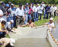 在第一次觀摩會後,司長除了對於白蝦淡水養殖成果感到相當滿意外並將現況呈報部長,部長獲悉後也對此一新養殖模式展現高度興趣,並希望能夠實際了解白蝦淡水養殖現況,再加上部分未能參加第一次觀摩會的養殖戶積極要求之下,於七月廿四日再度於Atiocoyo舉辦白蝦淡水養殖觀摩會,當日盛況猶勝於前次觀摩會,薩國農牧部Loucel部長親臨會場致詞,當地電視台也派員於現場進行採訪工作,隨後除了到養殖池邊觀看白蝦捕獲情形外,並由團長引領部長與參觀群眾至鄰近推廣戶的養殖池參觀白蝦淡水養殖情形,現場介紹白蝦淡水養殖現況與方法,並回答養殖戶們提出的相關問題,中午並以現場捕撈的白蝦與吳郭魚招待部長、媒體記者與養殖戶們,看著大夥用餐時的愉快神情,白蝦的美味似乎全都寫在臉上。