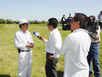 | 觀摩會由漁業司長Mario(左三)與技術團陳啟民團長(左二)共同主持 | 陳啟民團長接受當地無線電視台Tele 2採訪,介紹白蝦淡水養殖現況 |