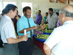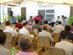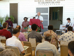 | 我駐索鄧大使備殷於慶祝成果展中致詞 | 索國總理H.E. Sir. Allan Kemakeza於慶祝會中表達對駐索技術團之感謝。 |