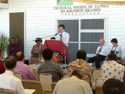 三月廿一日當天在煦麗和風豔陽高照下,中、索技術合作廿週年慶祝活動就在穿過斗大的中華民國駐索羅門技術團大門後,於金黃色稻香四處飄逸的會場上展開序幕。我技術團特邀請索國政、商、學界各部政要及駐索外交使節團等,約計二百人參與此盛會。典禮由索國農牧部次長Dr. Morgan Wairiu揭開序幕,依次由中華民國鄧大使、索國總理及國合會廖副秘書長世傑致詞。索國Sir. Allan Kemakeza總理於致詞中表示,感謝我技術團廿年的默默耕耘,讓索國有能力自己生產稻米,尤其推展社區發展稻作計畫更是不遺餘力。二○○○年索國不幸遭遇族裔衝突,Metapona稻作墾區關閉,稻米生產幾乎停止,所幸去年政治稍平靜,全國稻作栽培面積在技術團與農牧部的合作下完成推廣四九三公頃,生產稻穀二、二六七公噸,真的值得讚許,希望今年的推廣成績會更輝煌。
