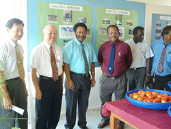 典禮結束後,潘團長生才導覽索國總督、總理及與會貴賓至展覽室參觀過去廿年的成果照片,及技術團生產的稻米、蔬菜、瓜果等等。之後,轉往田間實地參觀蔬菜作物栽培,總督對我技術團栽種的玉米(飼料玉米)也頗有興趣頻頻發問。另外網室栽培也引起大家的重視,因熱帶氣候蟲害多,如不使用農藥,僅有網室栽培才可行。稻作栽培則由陳專家正昌向總督講解,總督對我技術團的高產稻作是嘖嘖稱奇,感嘆的說:「如全國都有像中華民國技術團的栽培技術,今天索羅門的稻米就可輸出,不需再依靠進口,並且還可節省外匯流失。」這席話,無疑為一直以來默默付出的技術人員,給予了莫大的鼓舞與支持。