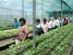 | 鄧大使(左二)與索國總督(左三)、總理(右三)熱情參觀於展示會場合照。 | 索國總督夫人(左前一)與鄧大使夫人(左前二)參觀網室栽培。 |