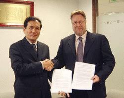 | Mr. Schroder此行並與本會李助理秘書長及相關單位主管召開合作洽商會議,會中雙方亦同意除延續過去的中荷「講師及人員交流合作計畫」(Academic experts/Staff members Exchange Program)外,未來將視機會合組「專案團隊」(Taskforce),積極尋求由國際組織贊助經費之計畫的合作,以雙方專業管理能力,運用國際社會資源及發揮槓桿效益,共同協助開發中國家發展。﹙右圖為會後本會李助理秘書長與Mr. Schroder簽署乙份會議紀錄,作為日後雙方合作之依據。﹚ | ![]() |