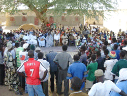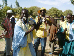 | 塞國漁業部長Papa Diouf一行人在前往養殖中心的途中,受到村民載歌載舞熱烈歡迎。 | 我駐塞內加爾技術團輔導之當地漁民正為此次前來參觀的所有貴賓與群眾進行示範。 |