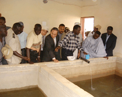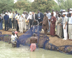 | 慶祝我技術團於塞北Richard Toll合作之吳郭魚養殖收穫典禮當天場面熱絡情形。 | 塞國漁業部長Papa Diouf一行人參觀Richard Toll水產養殖中心吳郭魚養殖。 |