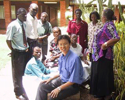 | 這是役男泰亨在馬拉威湖畔,跟一群居住在附近的小朋友一起合照。這裡的小朋友很喜歡照相,一副天生的模特兒特質,看她們一站到鏡頭面前,不出一會功夫,就可以馬上擺好姿勢作出笑容來。 | 泰亨參加愛滋病治療教育研習會,與其他的學員﹙也是馬拉威各地宣導愛滋病防治與協助病人接受治療的義工﹚共同討論課程中要即席表演的內容。 |