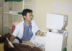 | 泰亨在馬拉威姆祖祖中央醫院的小兒科病房中檢視小朋友病情的情形。 | 在姆祖祖中央醫院工作的役男泰亨,必要時需自己幫小朋友作超音波的檢查情形。 |