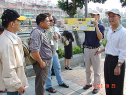 | 即使高雄市前鎮河發散著異味,學員們仍興致高昂地聽取負責單位簡報河川整治工程及現階段成果。學員們表示,在他們國家的大都市也都有類似的問題,所以雖然這堂課看的不是賞心悅目的風光,但卻有極大的意義和幫助。 |