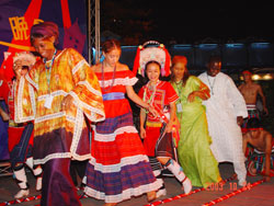 | 大多數研習班學員對於佛光山如何建立如此龐大的組織,並同時具有觀光與社區整合的效益,感到相當好奇。 | 各國學員穿著傳統服傭在台上和原住民舞者大飆竹桿舞。 |