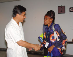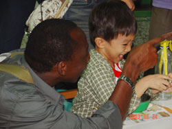 | 蘇縣長的演講引起廣大的迴響,學員們還熱請的邀請蘇縣長到他們國家當觀光局局長。 | 唔~~黑漆漆的叔叔。恍若小型聯合國的研習班學員參訪高雄市兒中心,引起中心孩童極大的好奇心,學員們也極盡所能的逗他們開心。 |