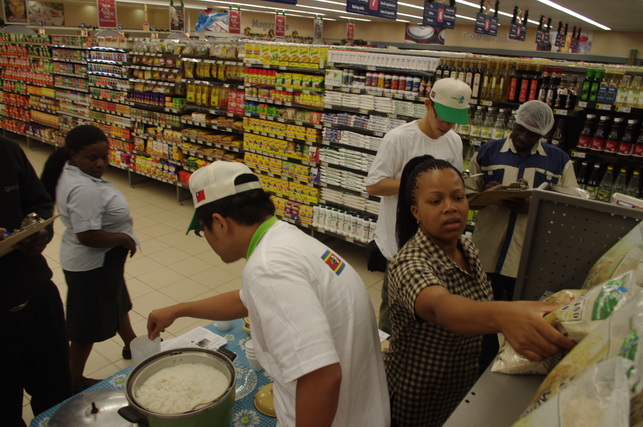 抵達駐地後,便跟著輔導技師協助史瓦濟蘭稻米行銷,稻米行銷從去(2010)年7月試辦至今剛滿一年。從去年8月出口南非德本,以及9月在史瓦濟蘭當地超市「Pick n pay」上架,銷售數量已經有一定幅度的成長。除了去年出口德本12公噸,最主要的進展在於當地超市進貨量的提升,初步估計去年9至11月稻米銷售至超市大約1.5公噸,時至今日,單月超市進貨量已達1.5噸左右,逐漸顯露出行銷推廣的成效。