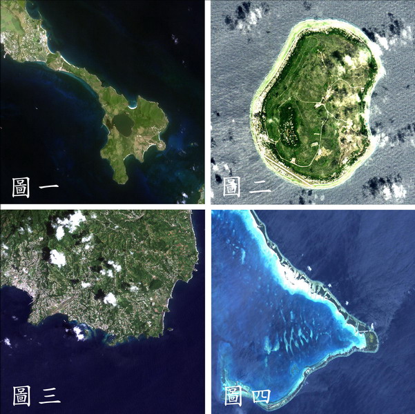 ▲福衛二號衛星拍攝的友邦島嶼國,圖1為聖克里斯多福及尼維斯,圖2為諾魯,圖3為聖文森及格林納丁南端,圖4為吉里巴斯共和國。 |