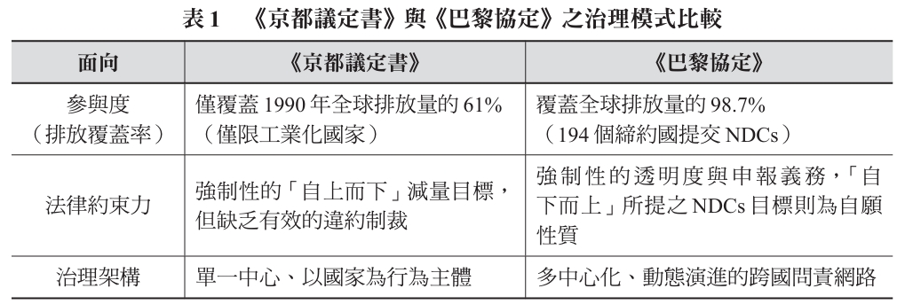 《巴黎協定》的核心制度創新,在於其從根本上翻轉了全球氣候治理的邏輯,即從過往《京都議定書》時期「由上而下」(top-down)的強制配額模式,轉型為「由下而上」(bottom-up) 的國家自主承諾機制。從制度設計的角度,1997 年的《京都議定書》依循的是實證主義下的技術官僚治理,試圖透過具法律約束力的減排分配達成治理目標。然而,該架構僅納入少數工業化國家,雖然展現了法律上的強制力,卻因缺乏廣泛的政治合法性與參與度,導致全球環境完整性(environmental integrity)受損。相較之下,《巴黎協定》則要求所有締約方提交「國家自定貢獻」,透過此一機制,成功將全球幾乎所有排放主體納入統一的制度框架。