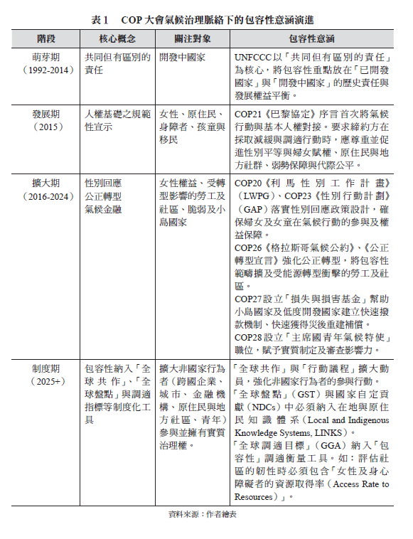 回顧氣候峰會的歷史進程,「包容性」(inclusivity)的範疇及意涵歷經了多重演變,從早期的人權道德性宣示,逐步轉向掌握實質權力與制度化的具體訴求。COP 大會的包容性意涵演進大致可歸納為以下階段: