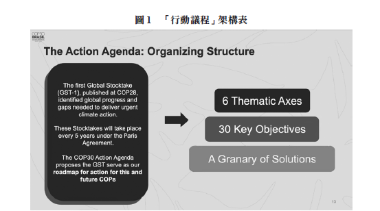 其 次,「行 動 議 程」 則 包 含 6 個 核 心 主 軸(Thematic Axes)、30 個 關 鍵 目 標(Key Objectives),形成涵蓋減緩、調適的氣候行動「解方之倉」(A Granary of Solutions),將遠大的氣候承諾轉化為可執行的具體計畫。截至COP30 大會結束,「行動議程」已成功動員 190 多個行動者(包含:國家、城市、企業、投資者及民間組織等),提出 480 多個減碳及調適行動。【8】