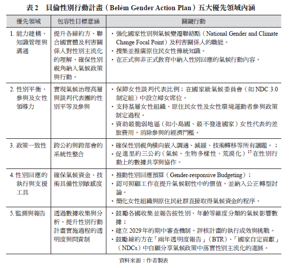 3.貝倫性別行動計劃:在「性別回應」治理層面,本屆大會也通過「貝倫性別行動計劃」(Belém Gender Action Plan),不僅接續與強化「利馬性別工作計劃」(Lima work programme on gender, LWPG)實施基礎,更提出 2026-2034 年氣候與性別工作的中長期策略架構。值得關注的是,「貝倫性別行動計劃」首次將照顧工作(Care Work)、女性環境捍衛者保護納入,並且肯認原住民女性在傳統智慧及守護生物多樣性的重要性。此外,並透過推動性別回應預算、制定性別化監測機制,以確保落實分配正義。