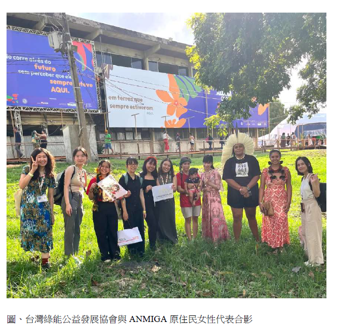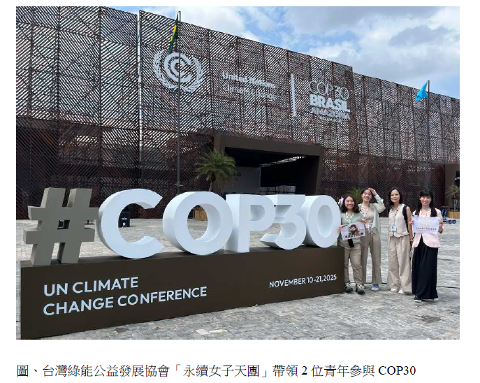 2025 年臺灣綠能公益發展協會結合行政院青年發展署的「青年百億海外圓夢基金計劃」, 帶領兩位「永續女子天團」練習生青年前進 COP30。協會主辦及參與了 4 場周邊會議,主題分別為:(1)「極端高溫下的脆弱族群氣候調適解方」,本場論壇關注極端高溫下的性別回應的調適策略,並由青年講者分享協會培訓女性成為「酷涼魔法使」幫助弱勢對象因應高溫挑戰的創意做法。【16】(2)「從女孩到阿嬤:性別回應的能源解方,邁向跨世代的公正轉型」,本場論壇邀請來自巴西與印尼專家,分享臺灣與全球落實性別平等綠能解方的最佳實踐方案。協會培訓「女性能源健檢師」的創新做法,亦獲得國際團隊的正面肯認。【17】(3)此外,筆者也受邀參與由臺灣氣候聯盟辦理的「數位賦能、與環境共生」周邊論壇,與國合會及國際產學專家交流科技如何服務社會福祉與強化氣候韌性。協會透過分享GW100 +綠能公益倡議,提出結合企業ESG 與非政府組織(Non-Governmental Organization, NGO)一同用綠能點亮社會的創新綠能解方。(4)第四場的藍區官方周邊論壇,在「賦能包容性氣候、循環、AI 與能源轉型方案:全球南方與脆弱社區中的青年、女性及原住民領導力」主題下,協會更實際帶領青年講者共同分享臺灣落實氣候正義與能源韌性的解方。【18】